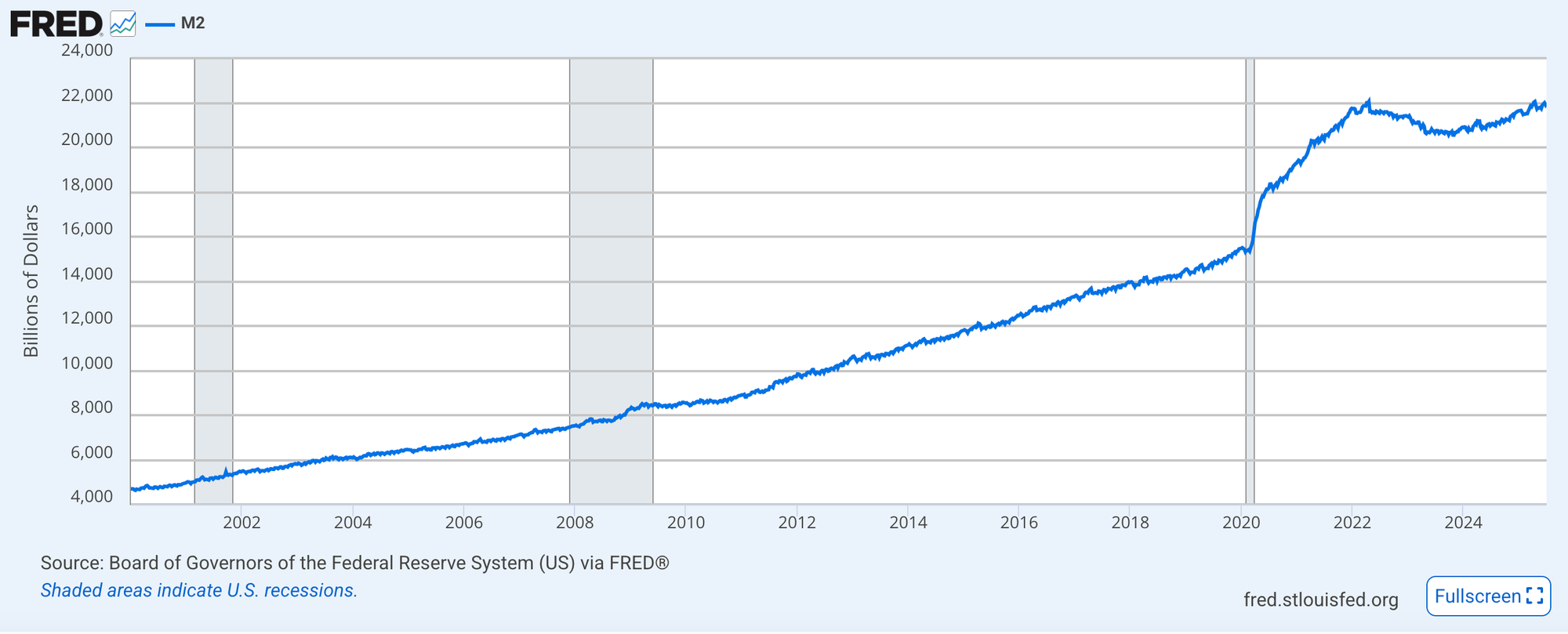 For the purposes of this investigation we will be using M2 as it offers the best view into money readily available for transactions and short-term savings that drive economic activity.