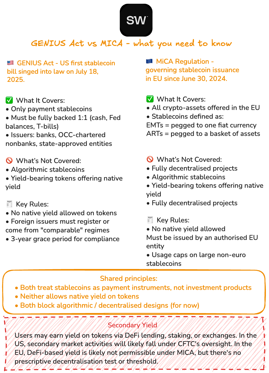For regulators both in the US and EU, the north star was to position stablecoins an everyday payment tool rather than an investment entailing risk. For user, this means that stablecoins in your wallet should be fully backed by real assets and regulated, giving you more confidence that your digital dollar or euro will hold its value. But it also means you won’t earn interest just by holding a token, so any yield will have to come from separate DeFi products or exchange arrangements, likely entailing customer exposure to higher leverage and higher smart contract risks.