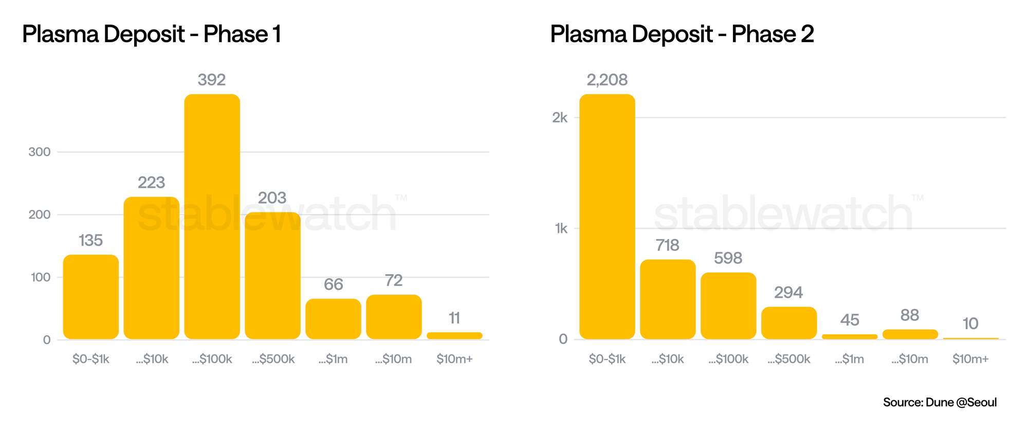 Phase 2 (June 12, 2025): Generated $500,034,343 from 1,944 addresses with a lower average of $257,219, demonstrating broader retail inclusion. The distribution shifted dramatically with 2,208 participants in the $0-$1k range, showing that Plasma was able to successfully extend the sale to retail participants.