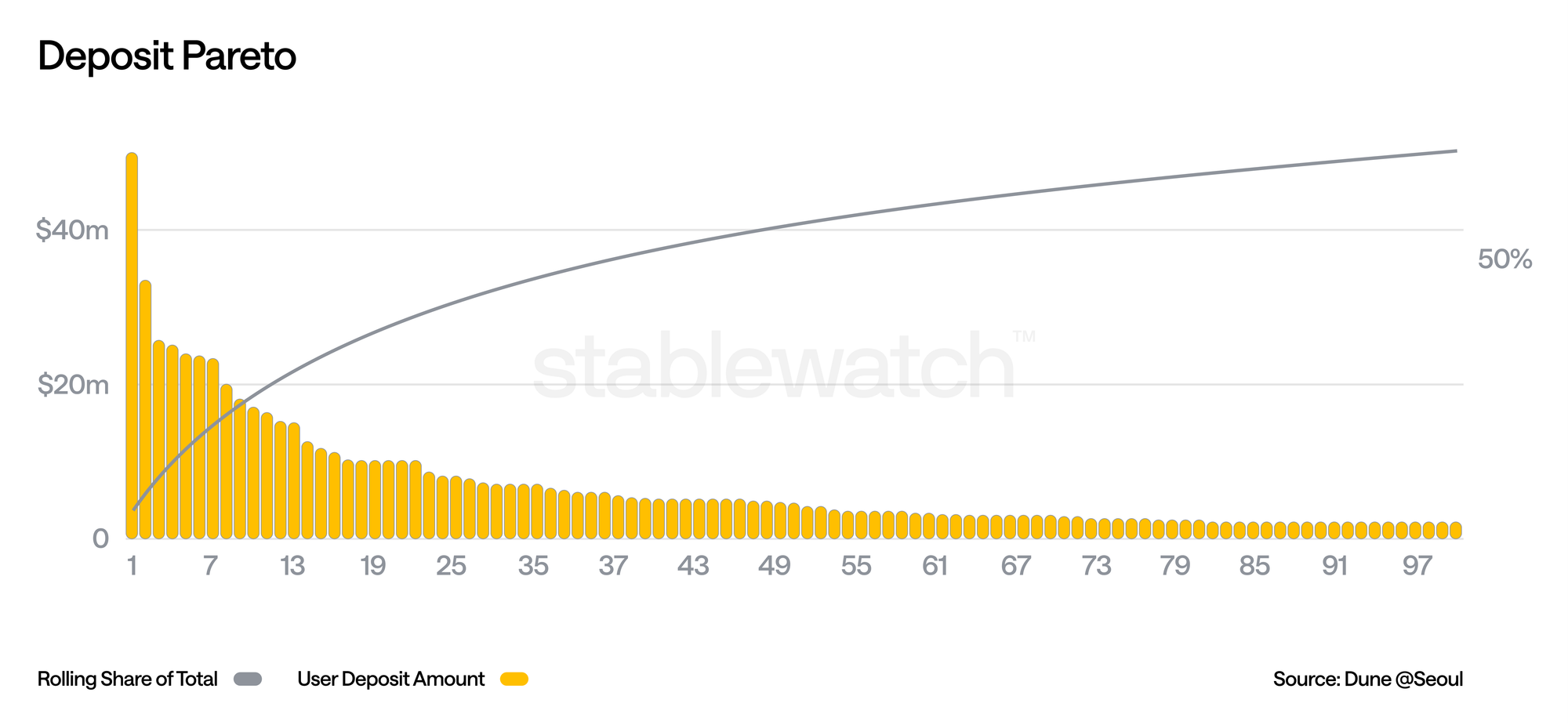 The deposit distribution exhibits the Pareto principle with top depositors controlling a significant percentage of allocation while broad-based participation is displayed across smaller investment amounts.