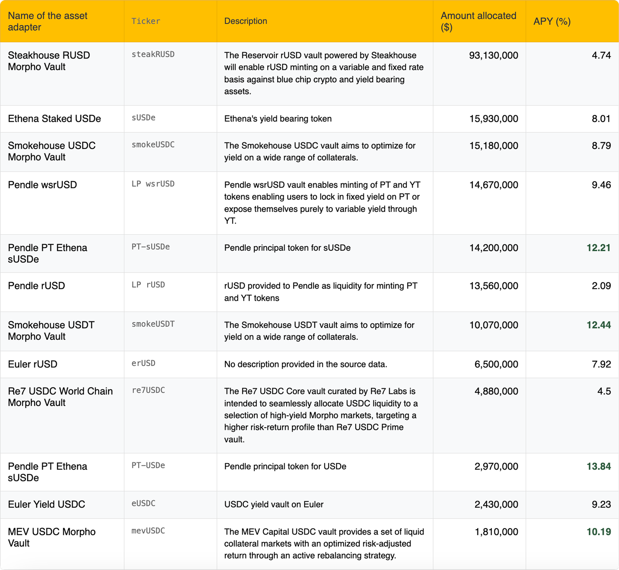 These Asset Adapters include top tier curators that have partnered with Reservoir in both Morpho and Euler vaults. Curating partners include Steakhouse, Re7, MEV, Gauntlet, Objective Labs, Hakutora, Hyperithm, Relend, Tau Labs, and others.