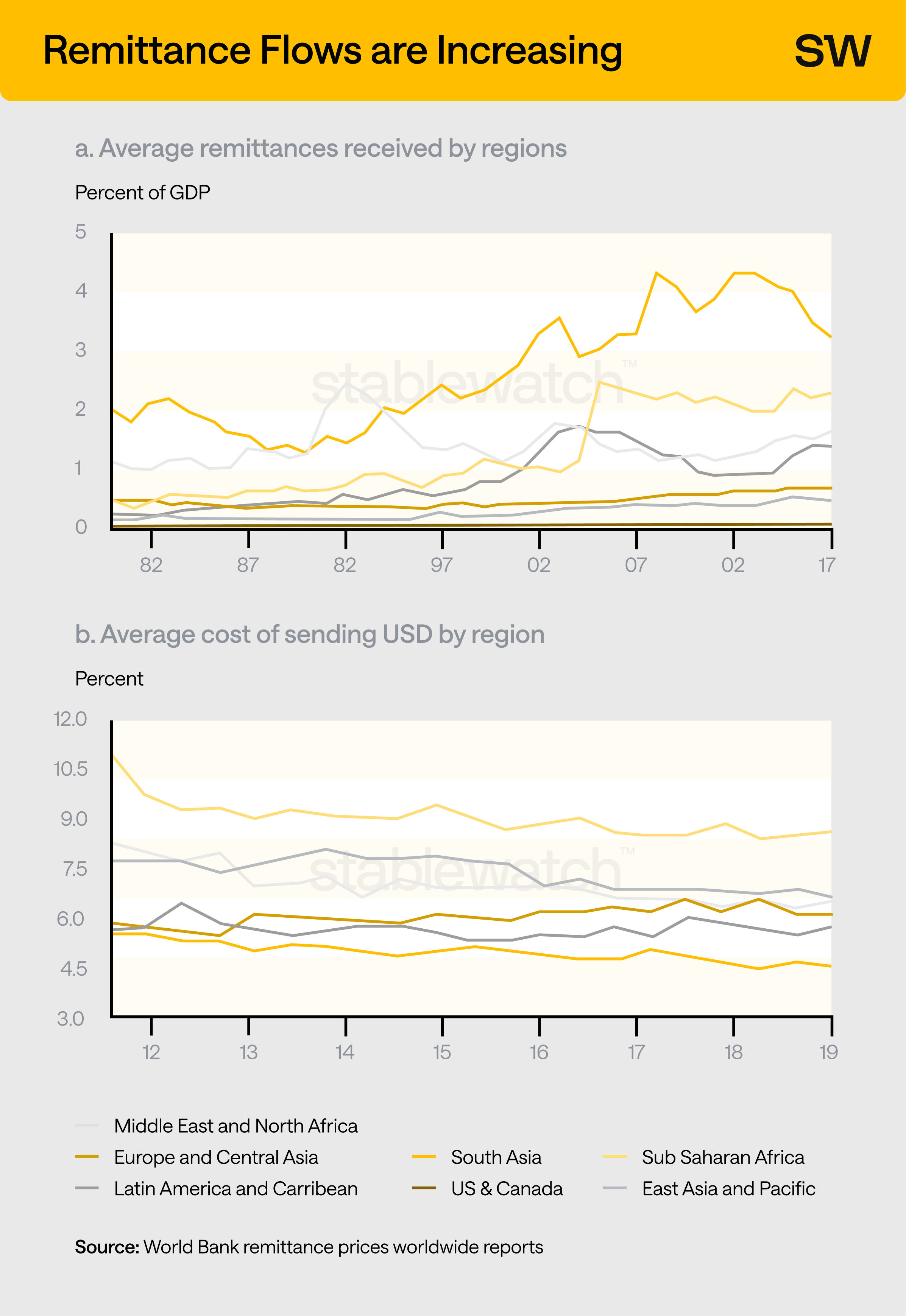 Compounding on top of this loss is the time delay, often a 3-5 day settlement period, which can create anxiety for families in immediate need of funds. According to the recent World Bank’s report, the average portion of the GDP linked to the remittances received by a region has been growing in emerging economies - signalling an increased need for improving the service. Yet, the same data shows that the average cost of sending a transaction has barely improved.