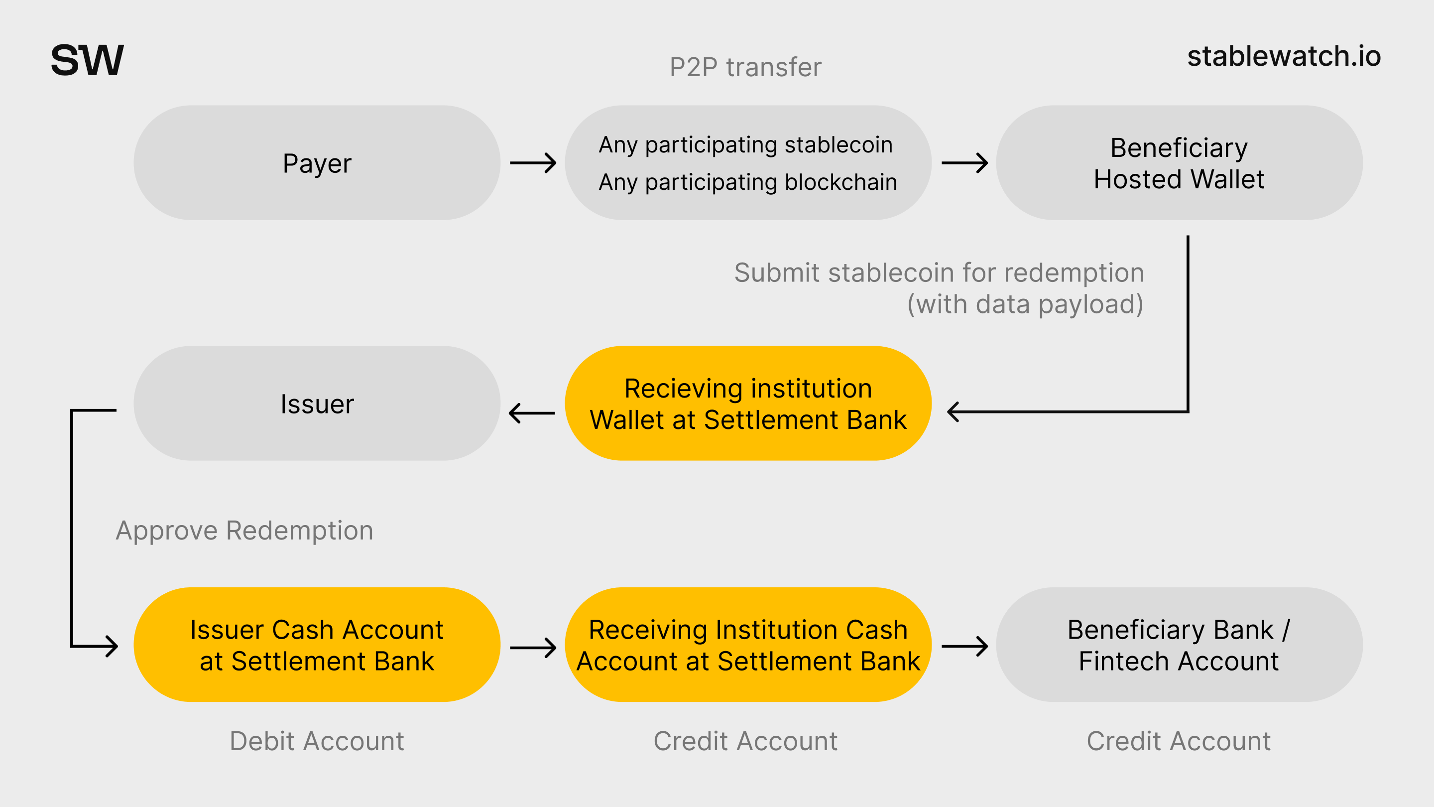 - The user’s bank account is debited, and the corresponding funds are credited to the stablecoin issuer’s account.