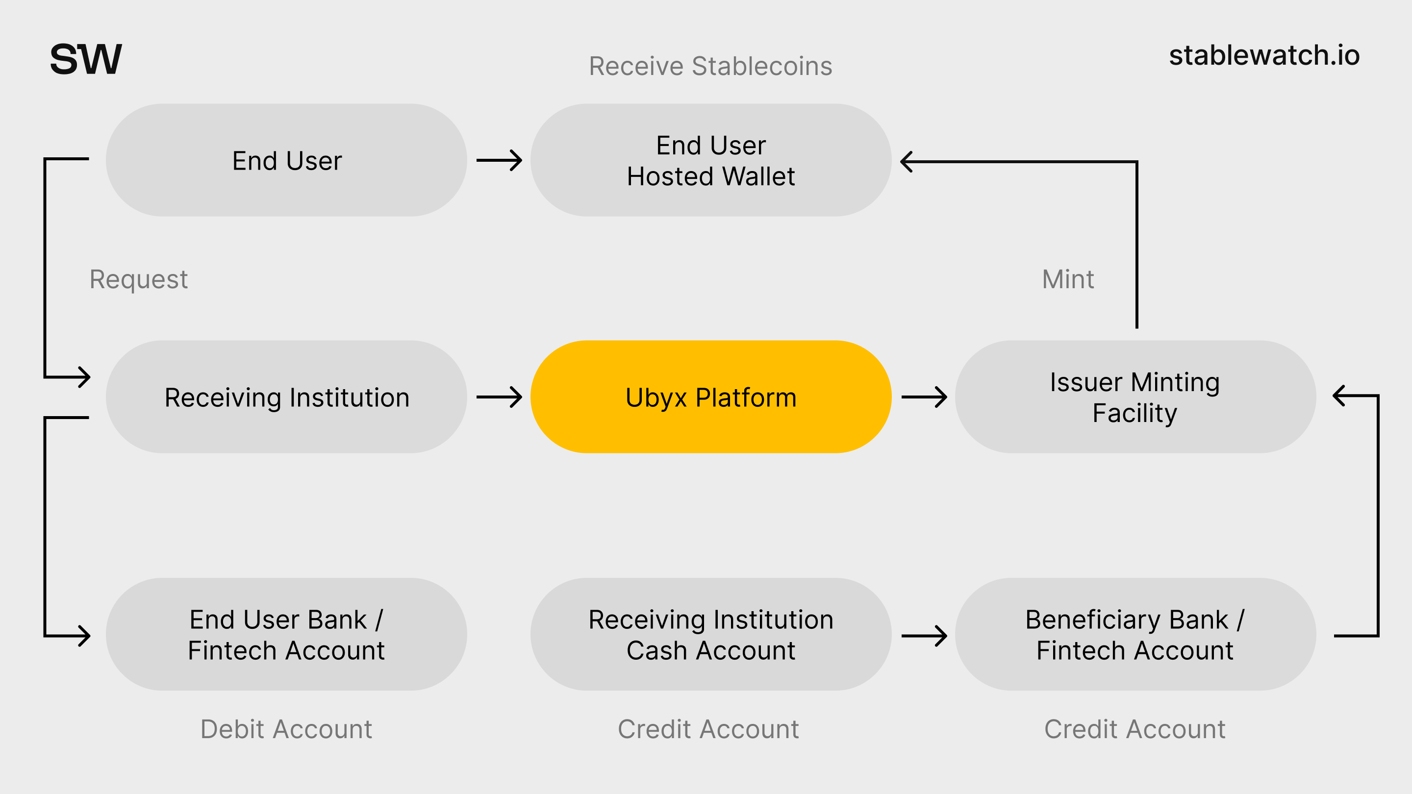 - Ubyx protocol subsequently routes the stablecoins to the relevant issuer from the institution's wallet through a settlement bank.